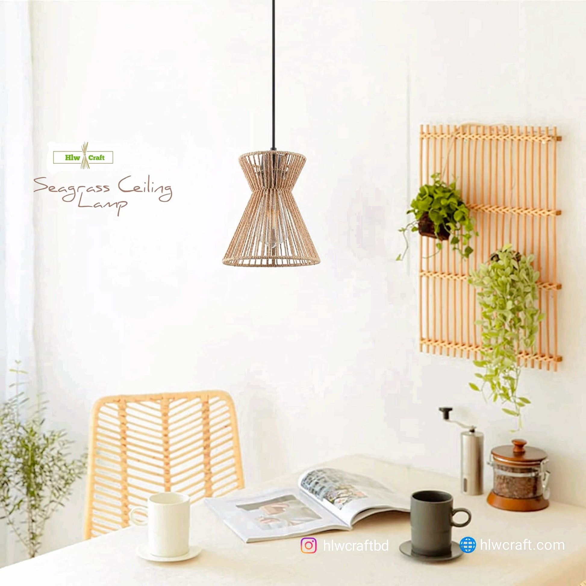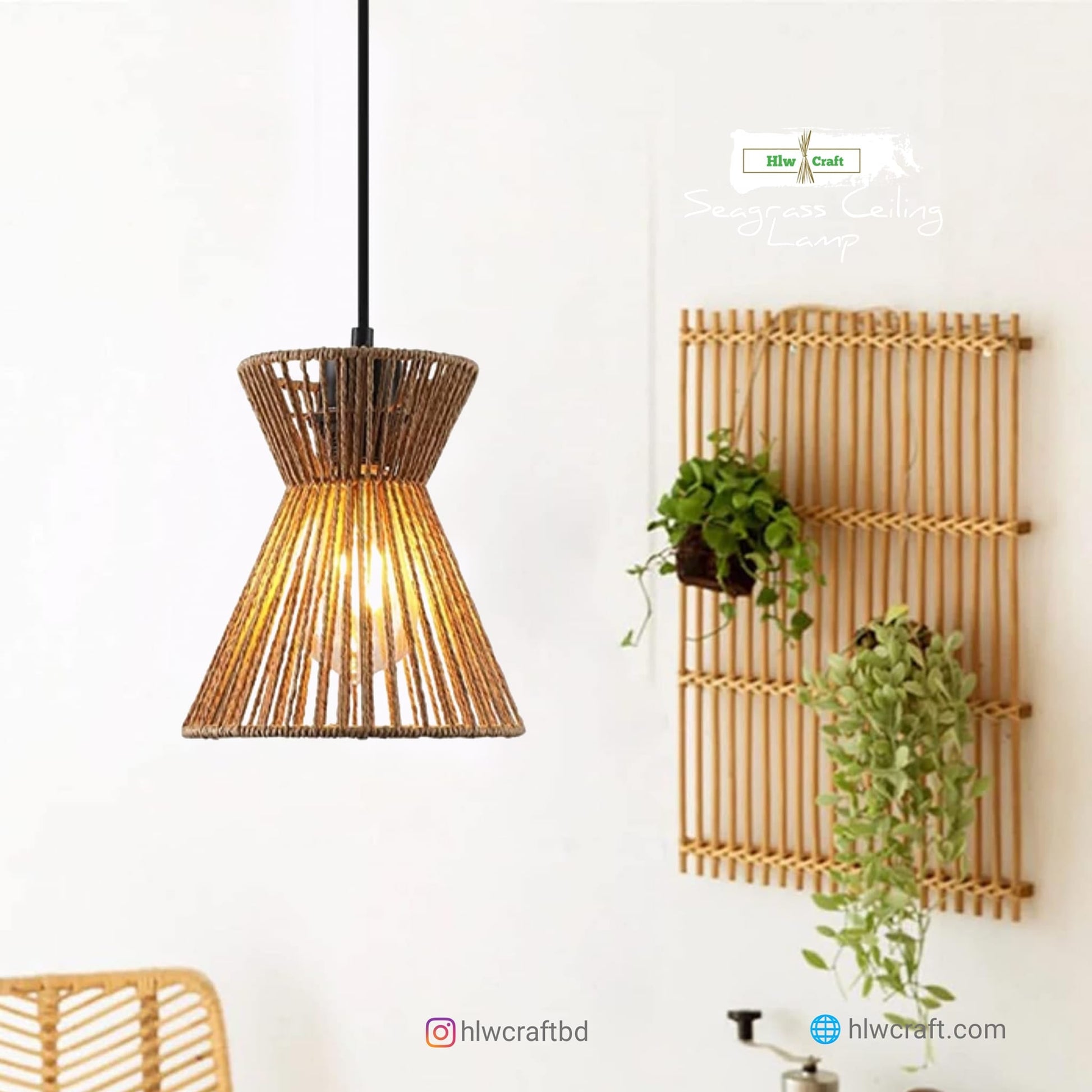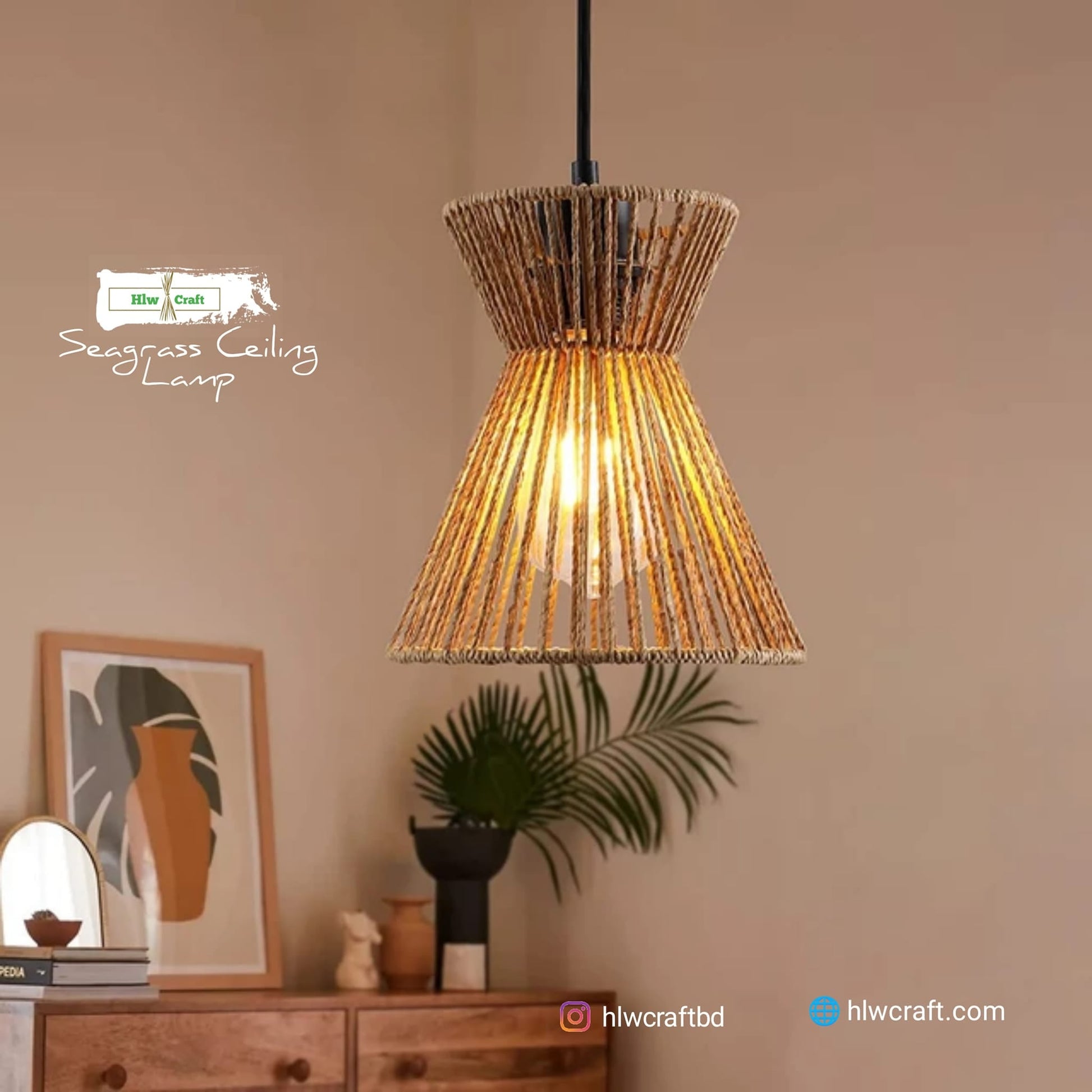 - Materials : Golden Fiber Seagrass, Metal Frame, Full Light Setup.